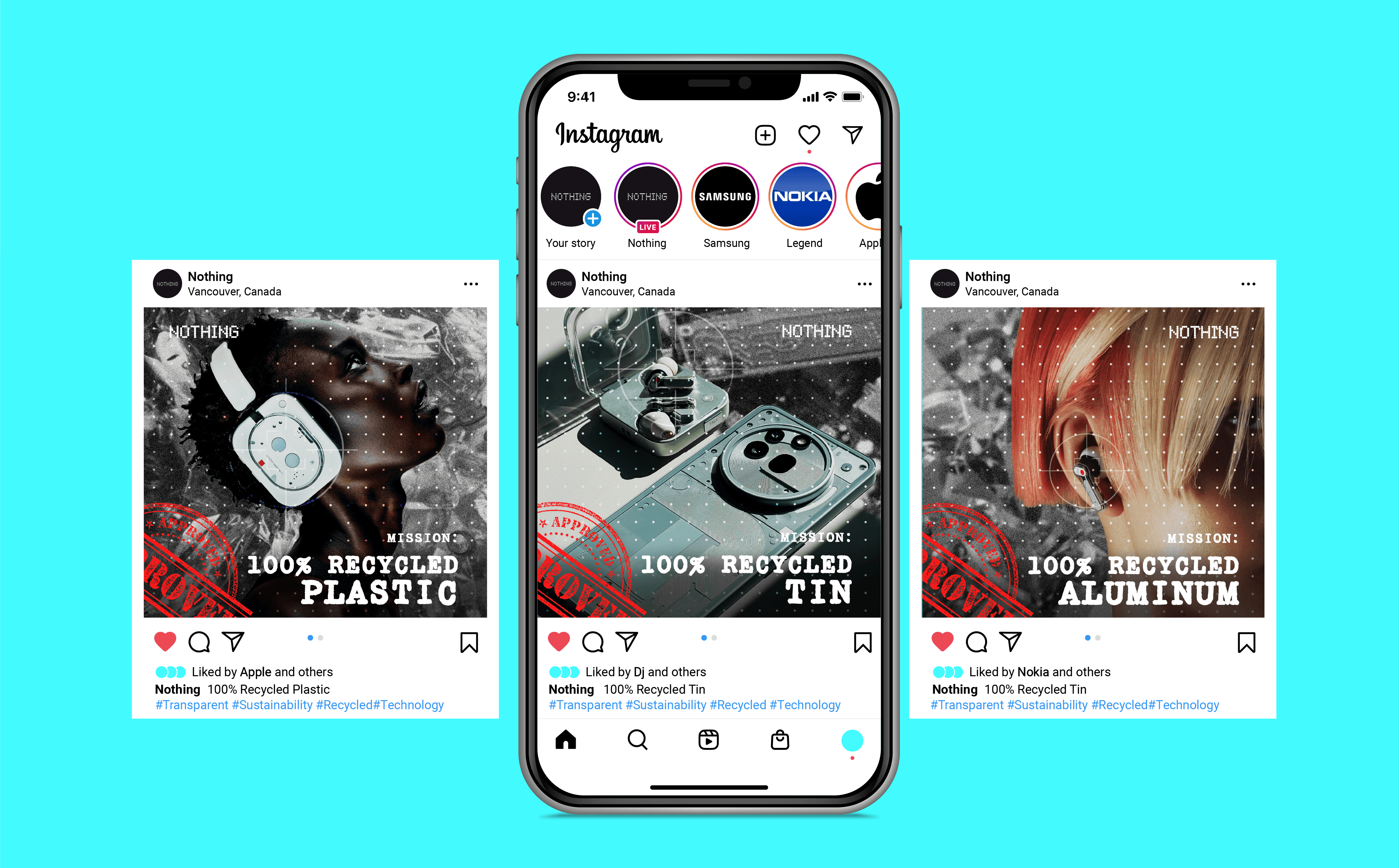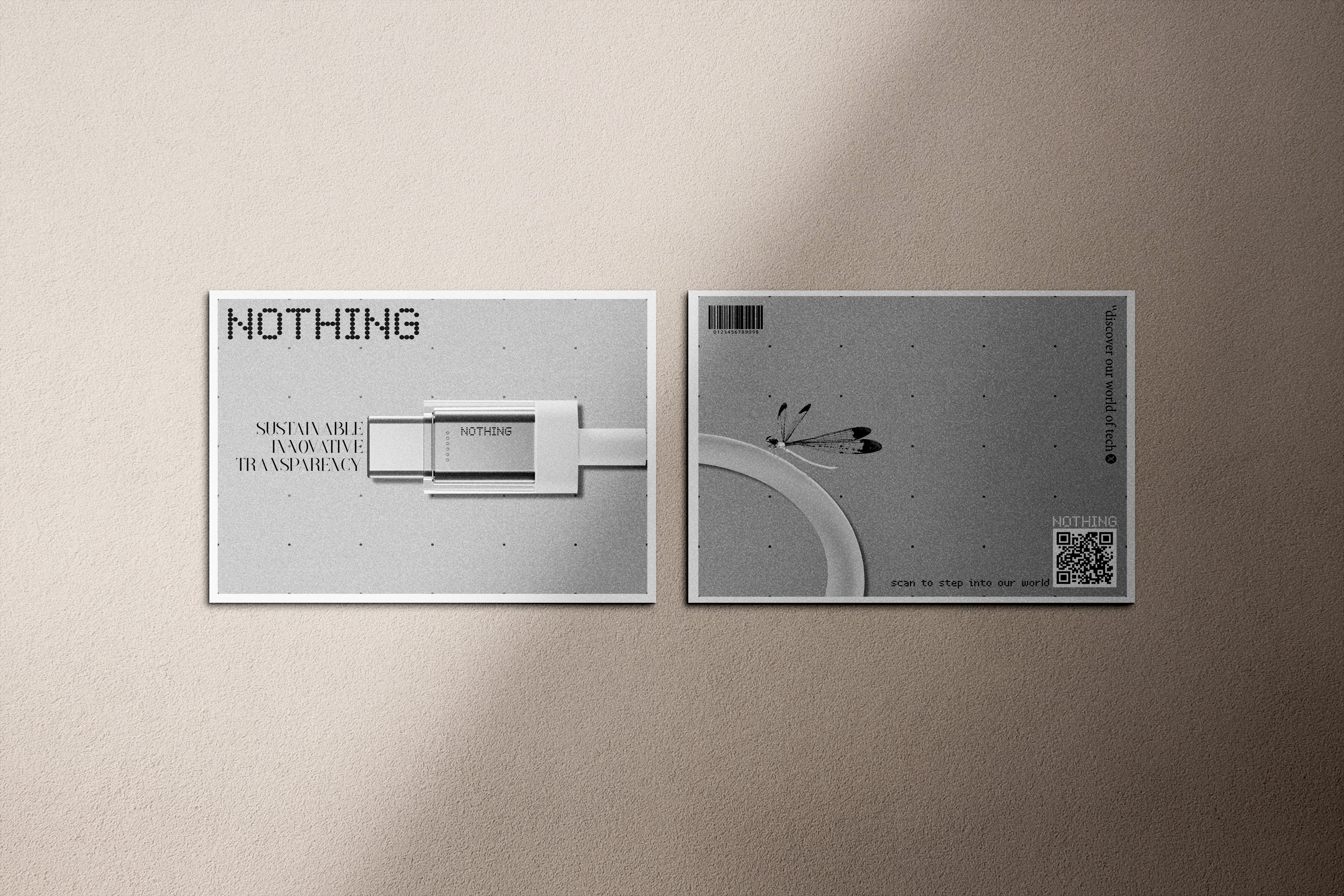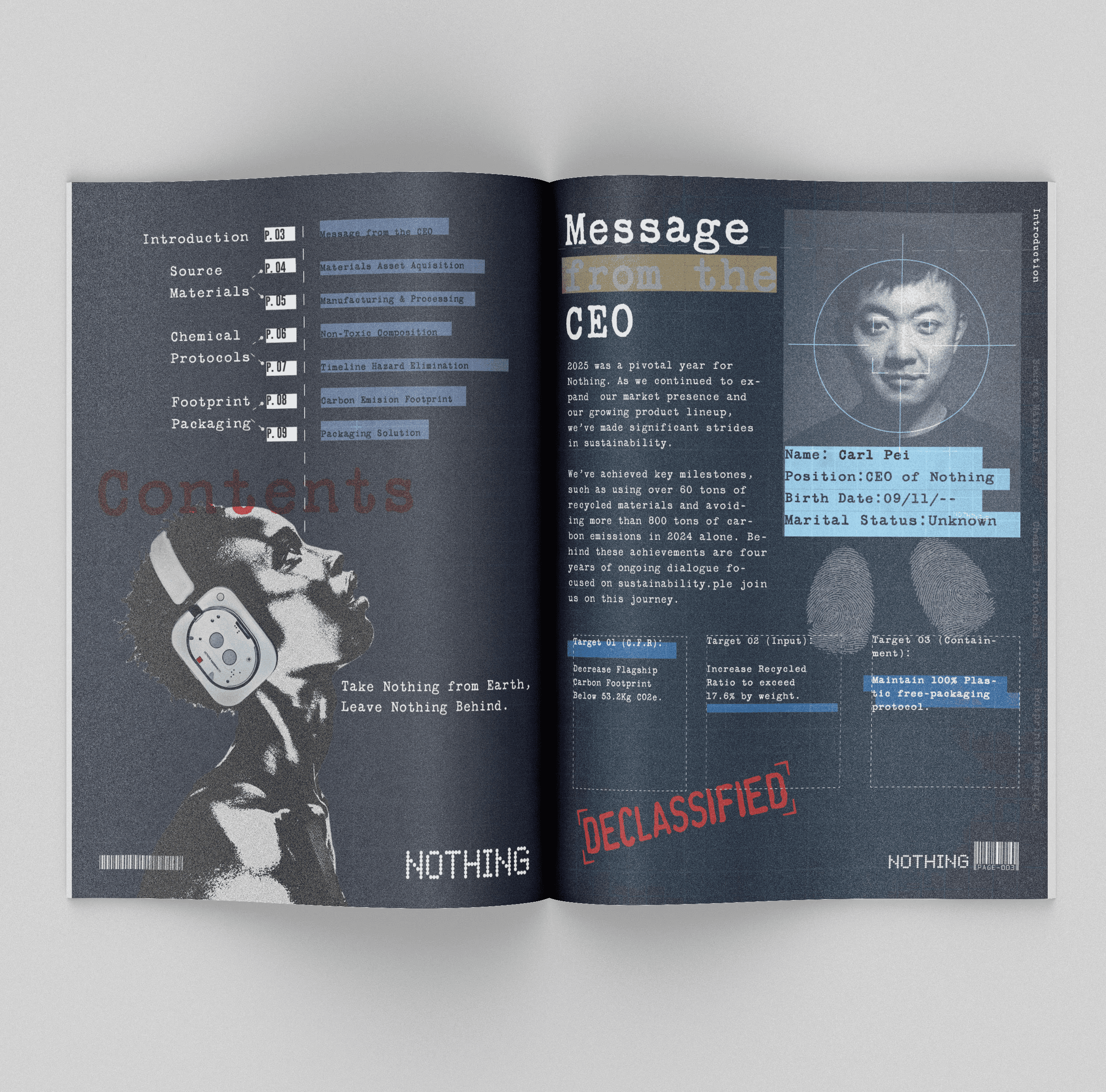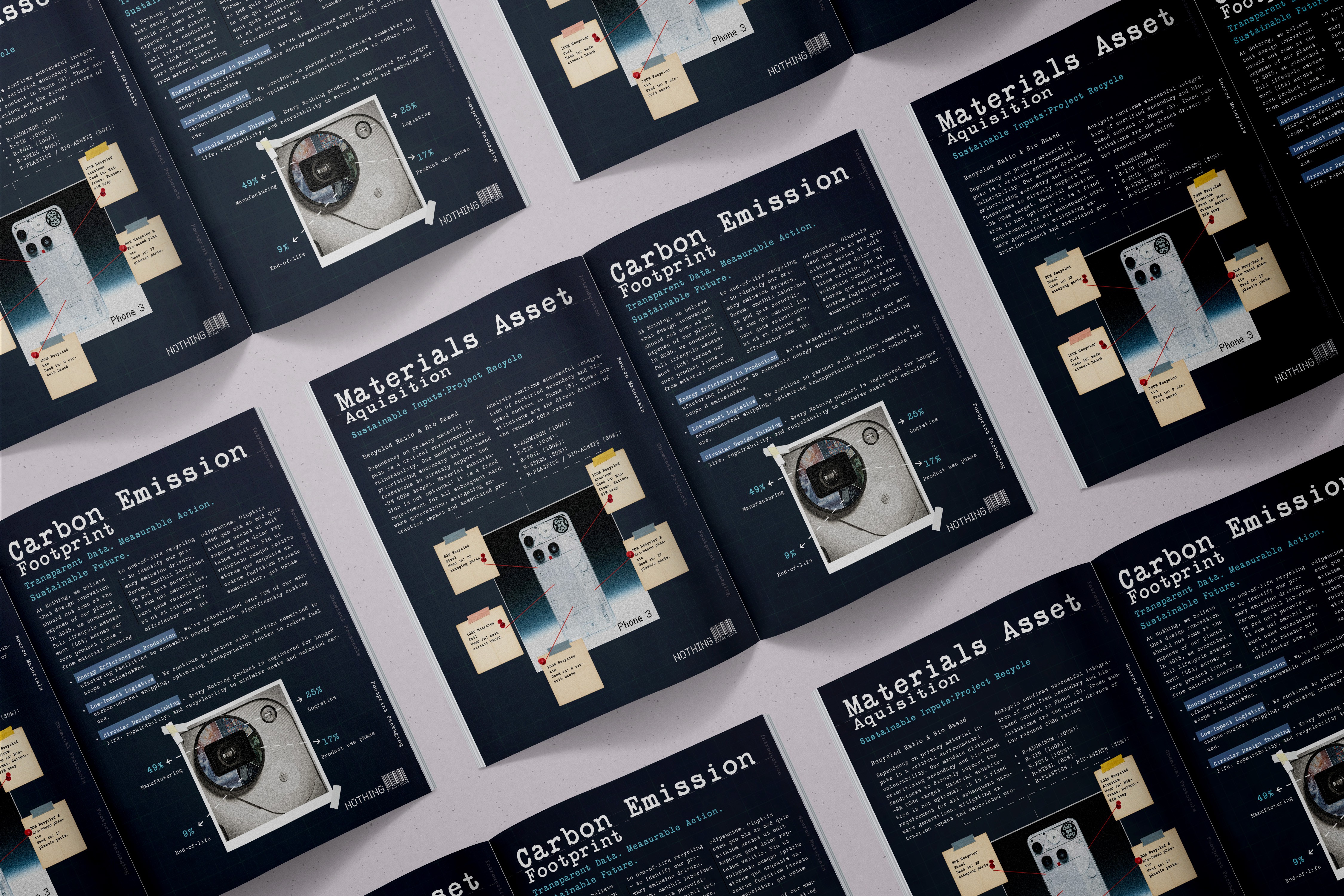 This project is a nine-page sustainability report designed for Nothing Tech, showcasing the company’s ongoing initiatives and long-term commitment to environmental responsibility. The layout combines clear narrative sections with data-driven storytelling, using custom infographics, icons, and visual cues to make complex information accessible and engaging. In addition to the main report, I expanded the project into a set of brand touchpoints, including a postcard and a social media ad campaign, that translated the report’s key insights into concise, visually cohesive materials. These extensions helped reinforce the messaging across both print and digital platforms. The report highlights essential metrics such as carbon reduction efforts, material transparency, recycling programs, and future sustainability targets, all while maintaining Nothing’s signature minimalist aesthetic. Through a balance of thoughtful design and strategic communication, this project presents the company’s impact and direction in a modern, visually refined format.